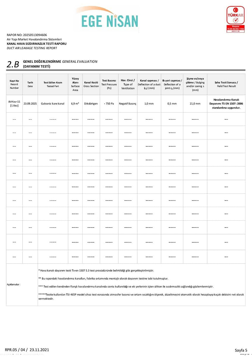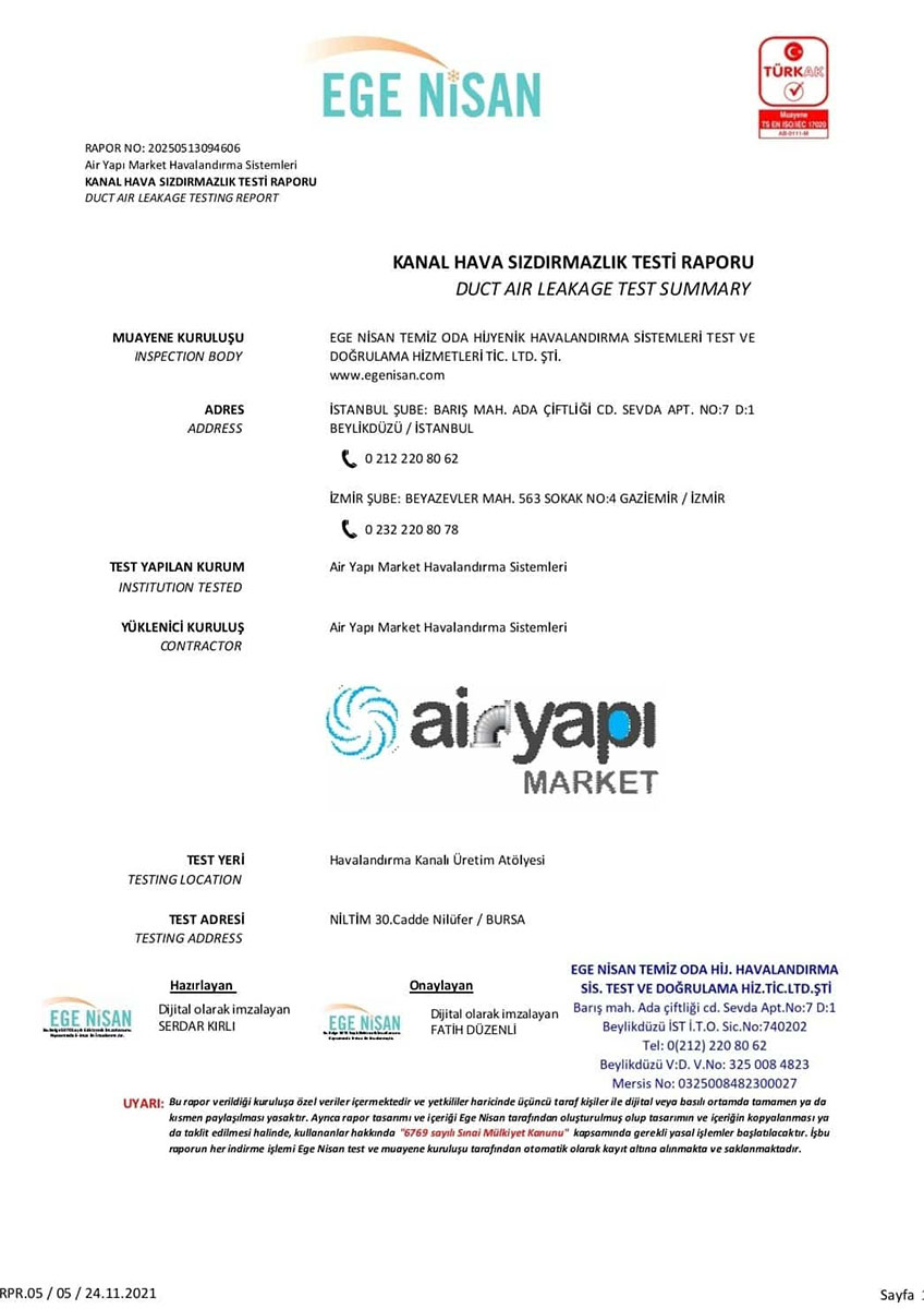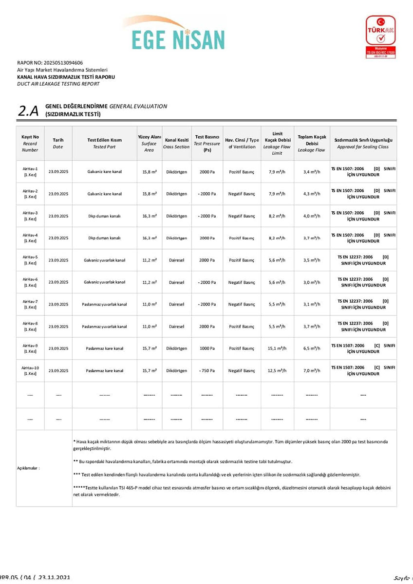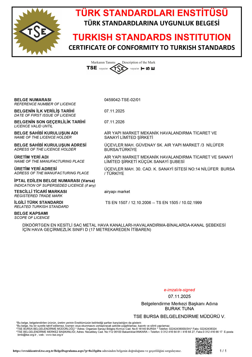 Tüm hava kanalı üretim ve uygulama süreçlerimiz, Türk Standartları Enstitüsü (TSE) kriterlerine uygun olarak gerçekleştirilmekte olup, sahip olduğumuz TSE belgeleri ile kalite standartlarımız güvence altına alınmaktadır. Bununla birlikte, sistemlerimizin performansını ve güvenilirliğini doğrulayan sızdırmazlık test raporları, uygulamalarımızın teknik yeterliliğini ortaya koymaktadır.