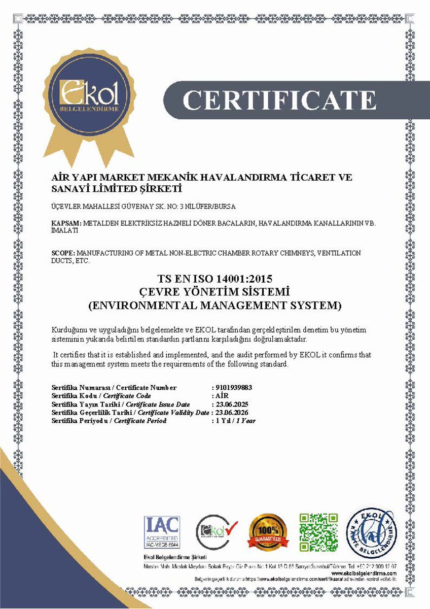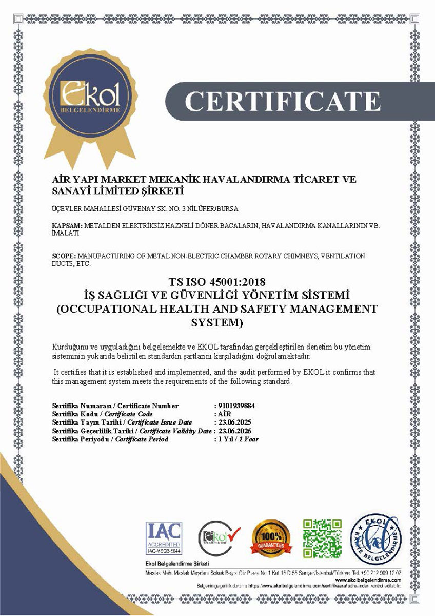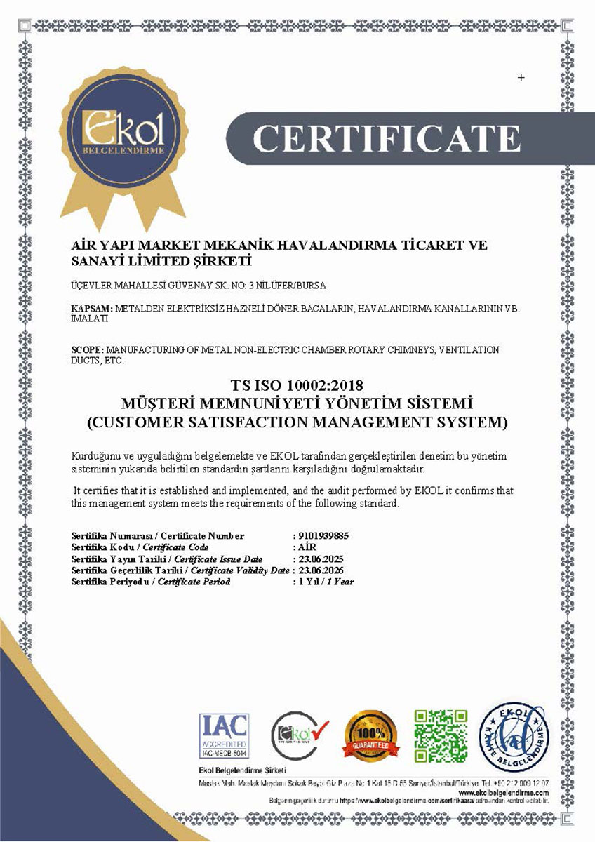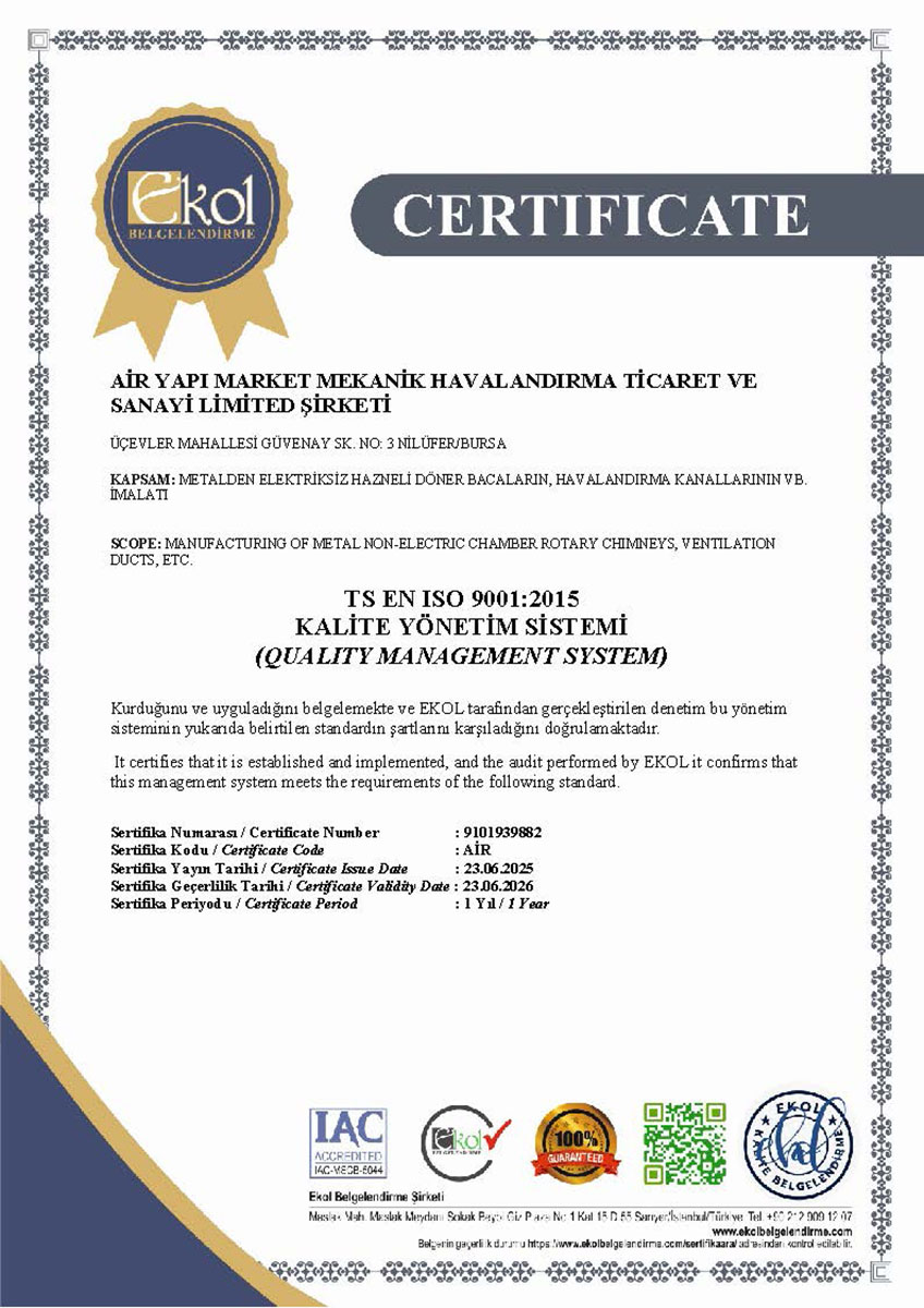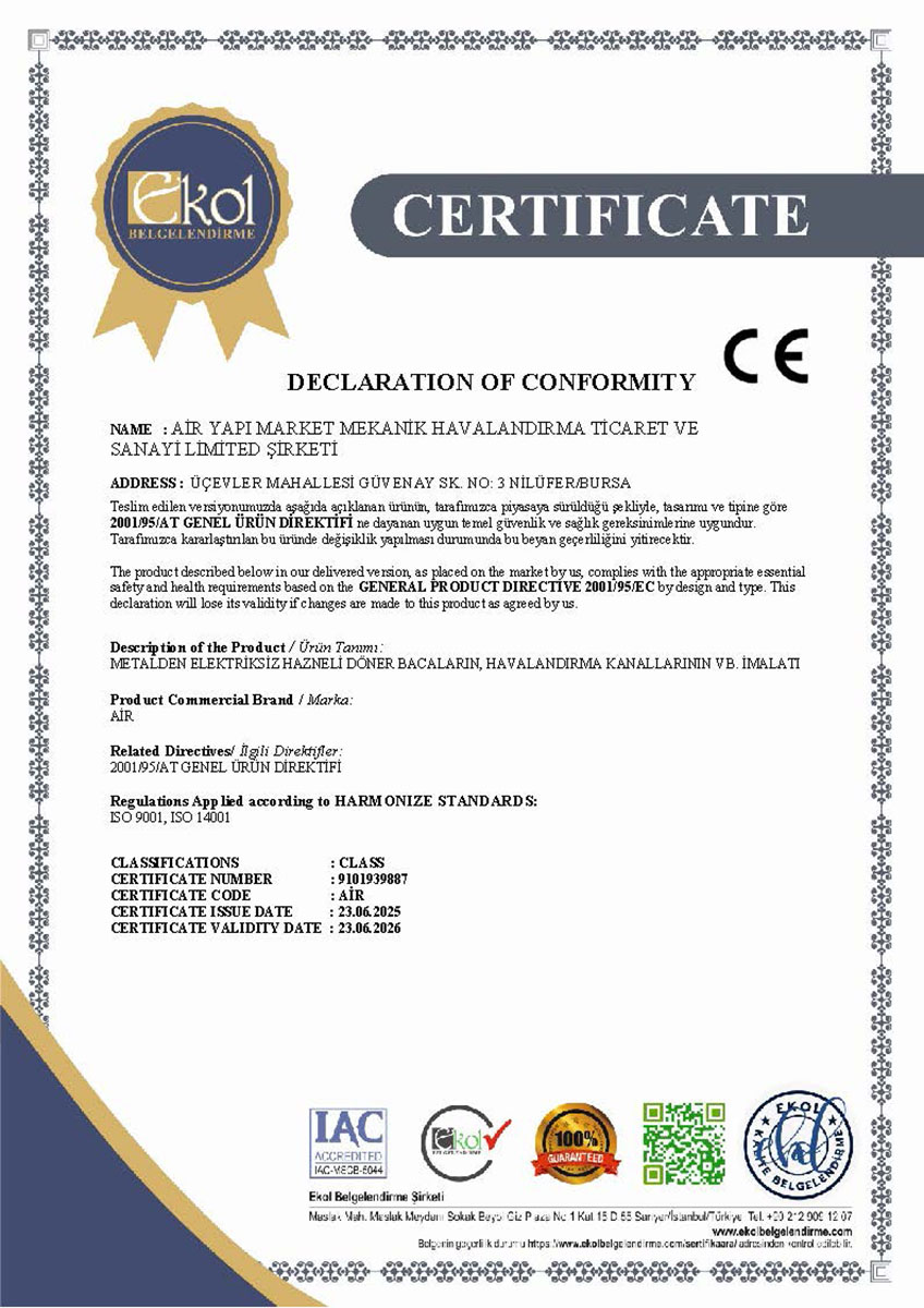 Tüm hava kanalı üretim ve uygulama süreçlerimiz, Türk Standartları Enstitüsü (TSE) kriterlerine uygun olarak gerçekleştirilmekte olup, sahip olduğumuz TSE belgeleri ile kalite standartlarımız güvence altına alınmaktadır. Bununla birlikte, sistemlerimizin performansını ve güvenilirliğini doğrulayan sızdırmazlık test raporları, uygulamalarımızın teknik yeterliliğini ortaya koymaktadır.